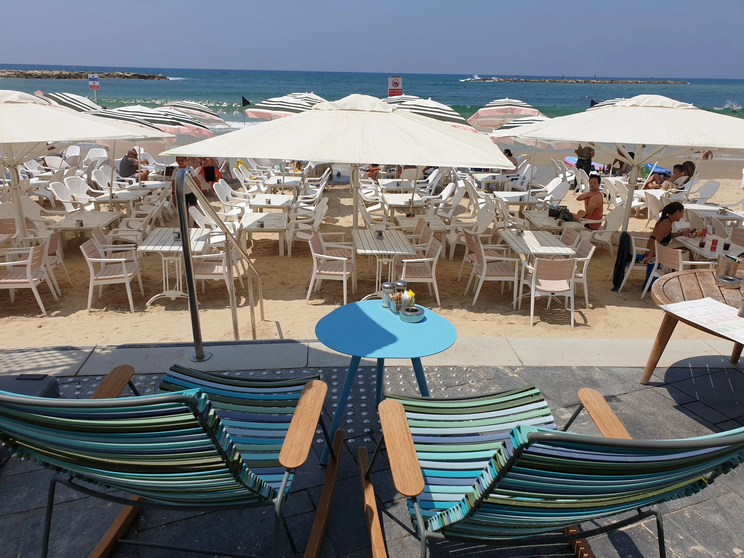 - Beach Club TLV: I have spent many happy days here this past summer! This beach club offers two sitting options: Sit right on the beach where you can combine an enjoyable swim with working on your tan, and then picking something delish off the easy-breezy menu, not forgetting a delightful cocktail. Or you can sit upstairs in the restaurant area. Enjoy the views and a slightly more upscale menu without the sand. - You have a surf school on-site as well as a beach boutique. The design is so pretty and relaxing! I enjoyed sitting in one of the rocking chairs on the upper level with a cocktail, watching the sunset.